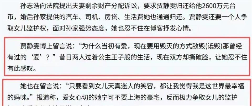 他们的离婚官司从2009年打到2010年。 在法庭上,双方争吵激烈,孙志浩一度提到演员黄磊的名字,指责贾静雯行为不端。 孙志浩方面提出,要求贾静雯支付2600万元新台币,并分割上海的共同房产。